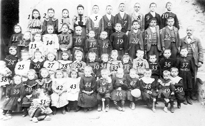 1 - Augustine Bernadoyes. 2 - Anna Sire. 3 - Marcelle Nigoul. 4 - Alphonsine Pélissier. 5 - Martin Duchand. 6 - Michel Girand. 7 - Pierre Sire. 8 - Alphonse Delonca. 9 - Antoine Flamand. 10 - François Mathieu. 11 - ?. 12 - Nièce M. Nigoul. 13 - Elisa Dabat. 14 - Emilie Dabat. 15 - Anna Girand. 16 - (Cuxous). 17 - Augustin Pélissier. 18 - "Tintin" Izard. 19 - "Zaza" Duchand. 20 - François Massé. 21 - Antonin Ferrié. 22 - Sylvain Sire. 23 - M. Alphonse Nigoul, instituteur. 24 - Nièce M. Nigoul. 25 - Cécile Flamand. 26 - Maria Duchand. 27 - Angèle Girand. 28 - Anne Massé. 29 - Delphine Pélissier. 30 - Anne Crabié. 31 - ?. 32 - Denise Crabié. 33 - ?. 34 - Joseph Duchan. 35 - Félix Bourreil. 36 - Georges Bourreil. 37 - Léopold Nigoul. 38 - ?. 39 - ?. 40 - ?. 41 - ?. 42 - Célestine Pélissier. 43 - Pauline Pélissier. 44 - ?. 45 - ?. 46 - René Crabier. 47 - Albert Crabié. 48 - Maurice Sire. 49 - Ernest Sire. 50 - Marcel Massé. 51 - ?. |