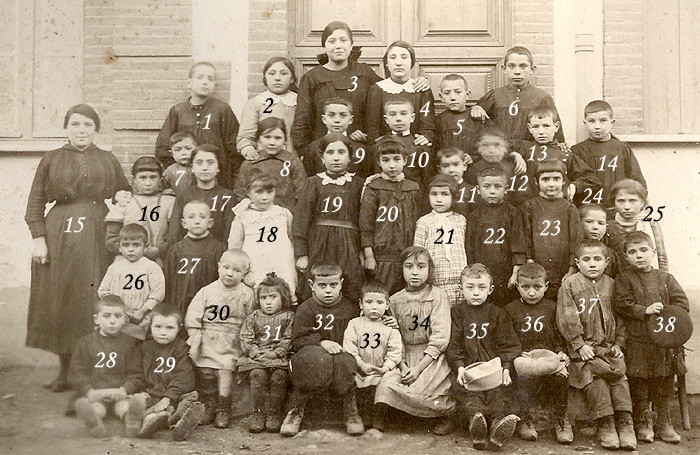 1 - François Ramon. 2 - Juliette Sire. 3 - Mle Serre, institutrice ?. 4 - Fernande Izard. 5 - Emile Girand. 6 - Albert Massé. 7 - René Delonca. 8 - M-Thérèse Izart. 9 - Joseph Simorre. 10 - Aimé Trousseu. 11 - Gérard Trousseu. 12 - Alphonse Barraut. 13 - Paul Fons. 14 - Georges Crabié. 15 - Mme Jol, institutrice. 16 - Ezilda Peypoch. 17 - Marie Crabié. 18 - Antoinette Massé. 19 - Lucienne Alquier. 20 - Yvonne Pélissier. 21 - Odette Crabié. 22 - Joseph Delonca. 23 - Augusta Palmade. 24 - Joseph Dabat. 25 - Rose Palau. 26 - Ludovic Sire. 27 - Pierre Girand. 28 - Raymond Simorre. 29 - Isidore Peypoch. 30 - Raoul Girand. 31 - Pierrette Palau. 32 - Sébastien Ferrier. 33 - Raymond Crabié. 34 - M-Rose Massé. 35 - Edgar Pacha. 36 - Antonin Bénézet. 37 - Clément Trilles. 38 - Paul Izart. |