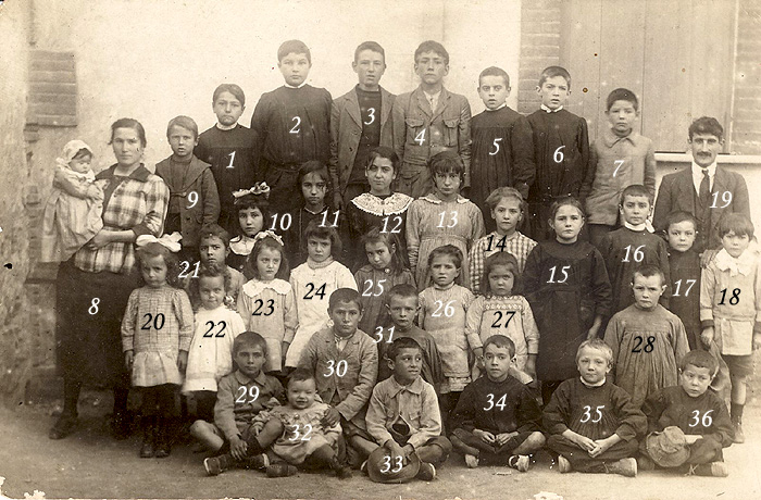 1 - Alphonse Barraut. 2 - Georges Crabié. 3 - Paul Fons. 4 - Emile Girand. 5 - Sébastien Ferrier. 6 - Marcel Trousseu. 7 - Joseph Dabat. 8 - Mme Bertrand. 9 - Joseph Bourreil. 10 - Odette Crabié. 11 - Yvonne Pélissier. 12 - Marie Crabié. 13 - Ezilda Peypoch. 14 - Louisette Benet. 15 - Antoinette Massé. 16 - Raymond Simorre. 17 - René Delonca. 18 - Aristide Barraut. 19 - M. Pierre Bertrand, instituteur. 20 - Georgette Izard. 21 - Augusta Palmade. 22 - Albertine Ramon. 23 - M-Louise Izart. 24 - ?. 25 - Pierrette Palau. 26 - M-Thérèse Trilles. 27 - Francine Huillet. 28 - Isidore Peypoch. 29 - Paul Izart. 30 - Clément Trilles. 31 - Etienne Peypoch. 32 - Maurice Catala. 33 - Joseph Delonca. 34 - Gérard Trousseu. 35 - Raoul Girand. 36 - Louis Delonca. |