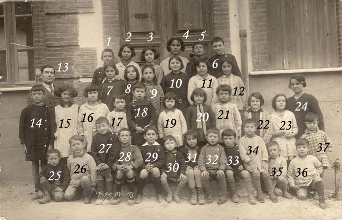 1- Francis Huillet. 2 - Andrée Pélissier. 3 - Jeannine Porteil. 4 - Albertine Ramon. 5 - André Sire. 6 - Maurice Catala. 7 - Francine Mathieu. 8 - Odette Massé. 9 - Gabrielle Buriel. 10 - Raymonde sire. 11 - Yvonne Ribo. 12 - Juliette Tarrene. 13 - M. Pierre Pagès, Instituteur. 14 - Pierre Crabié. 15 - Fernande Fons. 16 - Paule Ramon. 17 - Aimé Tarrène. 18 - Pierre Delonca. 19 - Aline Poumès. 20 - Elise Massé. 21 - Suzette Ville. 22 - Denise Chiffre. 23 - Odile Sire. 24 - Mme Honorine Pagès. 25 - Gabriel Delonca. 26 - Aimé Barraut. 27 - Adrien Pélissier. 28 - Germain Pélissier. 29 - Roger Massé. 30 - Edgar Massé. 31 - Yvette Pélissier. 32 - Marcel Olive. 33 - Claude Catala. 34 - Joseph Bedos. 35 - Louis Briu. 36 - Emile Bénezet. 37 - Yves Sire. |