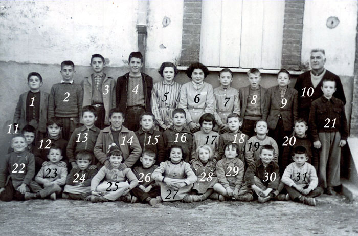 | 1 - Francis Izart. 2 - Henri Nomico. 3 - Claude Alibert. 4 - J-Pierre Jaupart. 5 - Alice Trousseu. 6 - Colette Pons. 7 - Jeannette Crabié. 8 - Christian Marti. 9 - André Ferrer. 10 - M. Pierre Pagès, instituteur. 11 - Roland Catala. 12 - Michel Delonca. 13 - Louis Salvat. 14 - Irénée Delonca. 15 - Alèxis Delonca. 16 - Gilbert Nomico. 17 - Josy Bénèzet. 18 - Christian Aubert. 19 - Jacqueline Crabié. 20 - Francis Bedos. 21 - Roger Alibert. 22 - J-Claude Peypoch. 23 - Alain Biles. 24 - Robert Alibert. 25 - M-Rose Delonca. 26 - Gilbert Rini. 27 - A-Marie Gazé. 28 - Lydie Alibert. 29 - Lydie Nomico. 30 - Guy Chaluleu. 31 - Hervé Jaupart. |