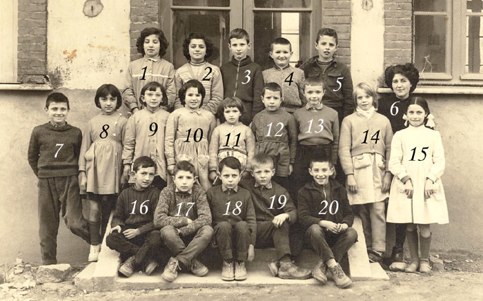| 1 - Josy Bénézet. 2 - Anne-Marie Gazé. 3 - Christian Aubert. 4 - Guy Chaluleu. 5 - Alain Jaupart. 6 - Mme Ginette Kilburg, institutrice. 7 - Roland Catala. 8 - Régine Alquier. 9 - Eulalie Alquier. 10 - Gisèle Chaluleu. 11 - Maguy Mathieu. 12 - Gérard Sire. 13 - Robert Alibert. 14 - Lydie Alibert. 15 - Marie-Rose Delonca. 16 - Gérard Alquier. 17 - Francis Bédos. 18 - Alain Biles. 19 - Jean-Claude Peypoch. 20 - Hervé Jaupart. |