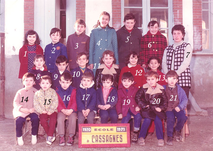 | 1 - Madeleine Martin. 2 - Jean Valejo. 3 - Richard Crabier. 4 - Martine Bourreil. 5 - Henri Planella. 6 - Claudie Duchand. 7 - Mme Simone Barraut, institutrice. 8 - Marie Angèle Sola. 9 - Ange Valejo. 10 - Emmanuel Valejo. 11 - Lucie Camillerie. 12 - Pascale Peypoch. 13 - Sylvie Delonca. 14 - Jean-Christophe Barraut. 15 - Marc Barraut. 16 - Philippe Peypoch. 17 - José Sola. 18 - ?. 19 - Alain Trilles. 20 - Claude Camillerie. 21 - Jean-Antonio Martin. |