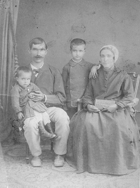 Louis Crabié sur les genoux de son père. Auguste Crabié (1845-1912) - Marie Crabié, née Dabat (1850 -1927) - François Crabié debout derrière. |
