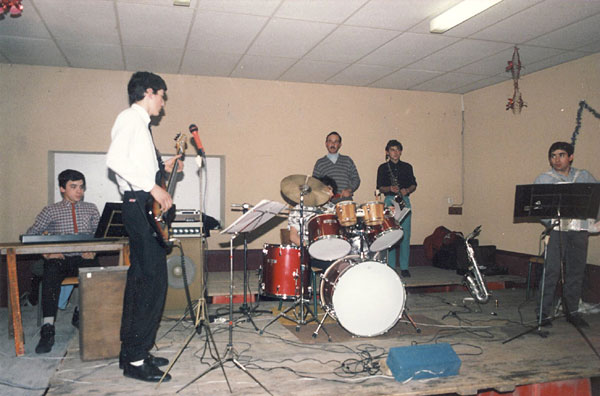 Daniel au clavier, Christian à la basse, Bernard à la batterie, Albert au saxo, Alain à l'arcordéon et Lucien au tambourin