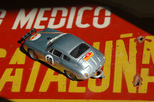 Modèles réduits de la Ferrari 250 GTO (N°1) et de la Porsche Carrera Abarth (N°10) au rallye 2 Catalognes 1965.