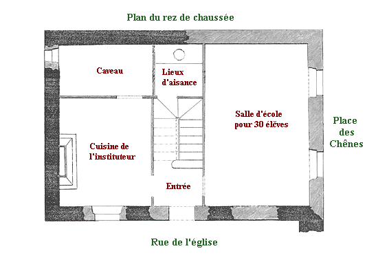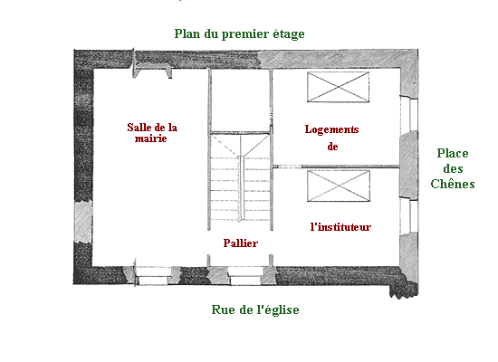 A l’origine, au rez-de-chaussée, la salle de classe et la Mairie étaient contiguës, séparées par une simple cloison. La passerelle n’existait pas et c’est par un simple escalier que l’on se rendait d’une part à l’école et d’autre part à la Mairie depuis la route. L’accès à l’étage s’effectuait par un escalier le long de la façade est, c’est-à-dire à partir du petit parc actuel, qui, à l’époque abritait un abreuvoir pour les chevaux, avec sa pompe à godets, et un jardin affecté à l’instituteur.
