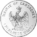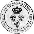 Ce cachet reprend en grande partie le motif de celui du premier empire à quelques variantes près. Légende : MAIRIE DE CASSAGNES (PYRENEES ORI les).