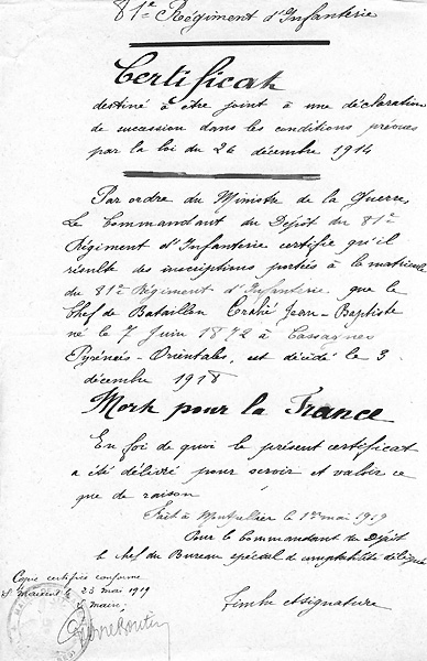 Commandant Jean-Baptiste Crabié - 81ème RI. Certificat pour la mention "Mort pour la France" Photo : Archives famille Blanc |