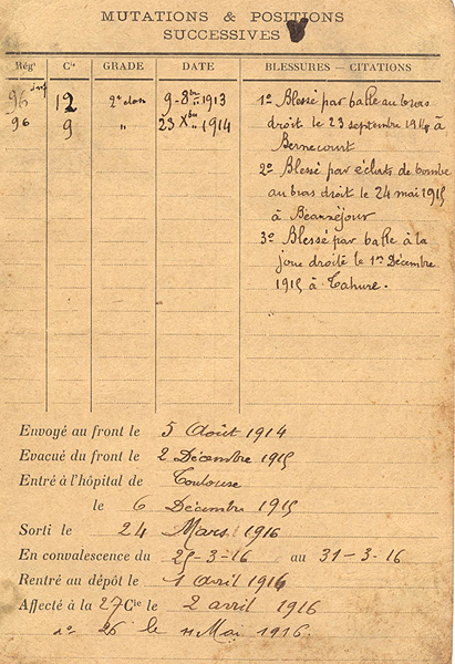 Parti en Champagne, attaque Beauséjour le 5 mars 1915. 2ème blessure le 24 mai 1915.