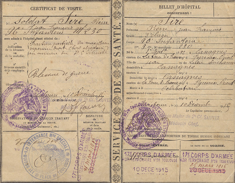 Rentré à l’hôpital Toulouse N°60 le 6 décembre, envoyé à l’hôpital 28 le 10 décembre jusqu’au 20.